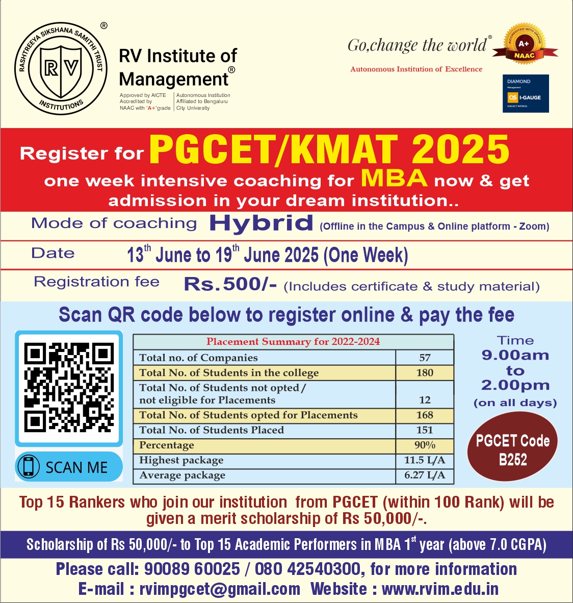 By leading world-class education, RV Institute of Management (RVIM) offers multiple avenues for the future leaders to thrive. Our dedicated and experienced faculty with deep industry experience, state-of-the art infrastructure, and personalised student focus prepare students for exciting careers in business. It is this unique pedagogy that gives our students an edge and keeps them a notch above from the rest.